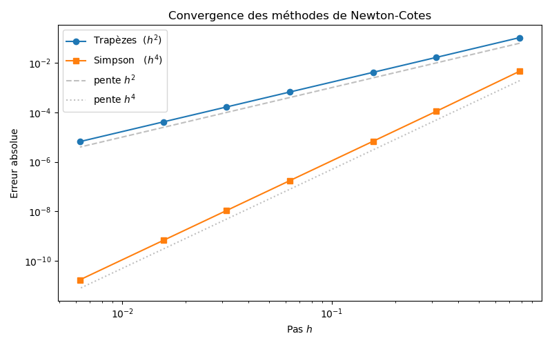 - Simpson : pente $-4$ (erreur $\propto h^4$)