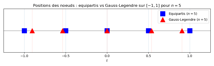 Les nœuds $t_i \in [-1, 1]$ sont les racines des polynômes de Legendre.
