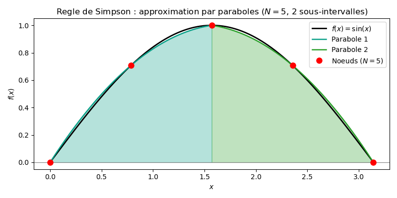 | Simpson | Erreur $\mathcal{O}(h^4)$ — bien meilleur pour les fonctions lisses ; scipy.integrate.simpson(y, x) |