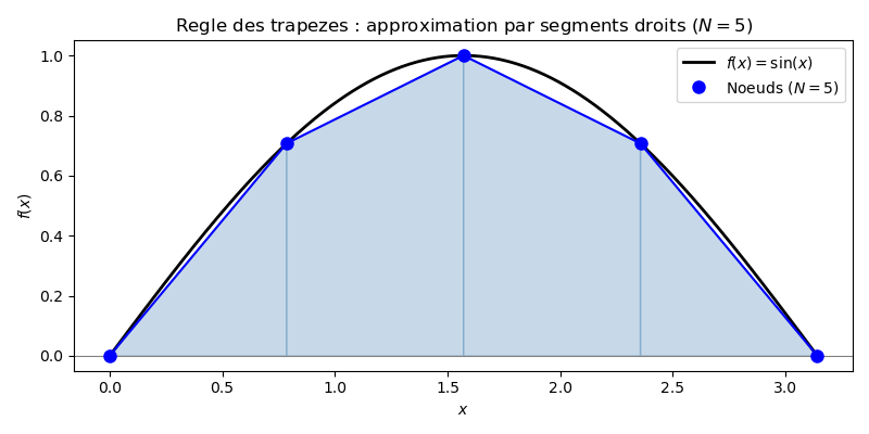 | Trapèzes | Erreur $\mathcal{O}(h^2)$ ; scipy.integrate.trapezoid(y, x) |